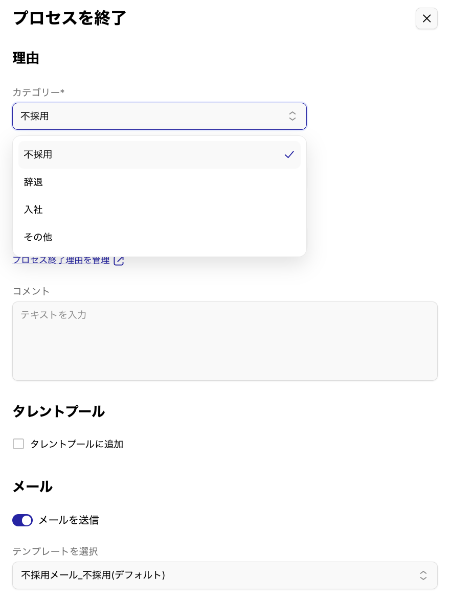 プロセス終了時、プロセス終了理由の「カテゴリー」に「不採用」を選択した場合に選択されます。