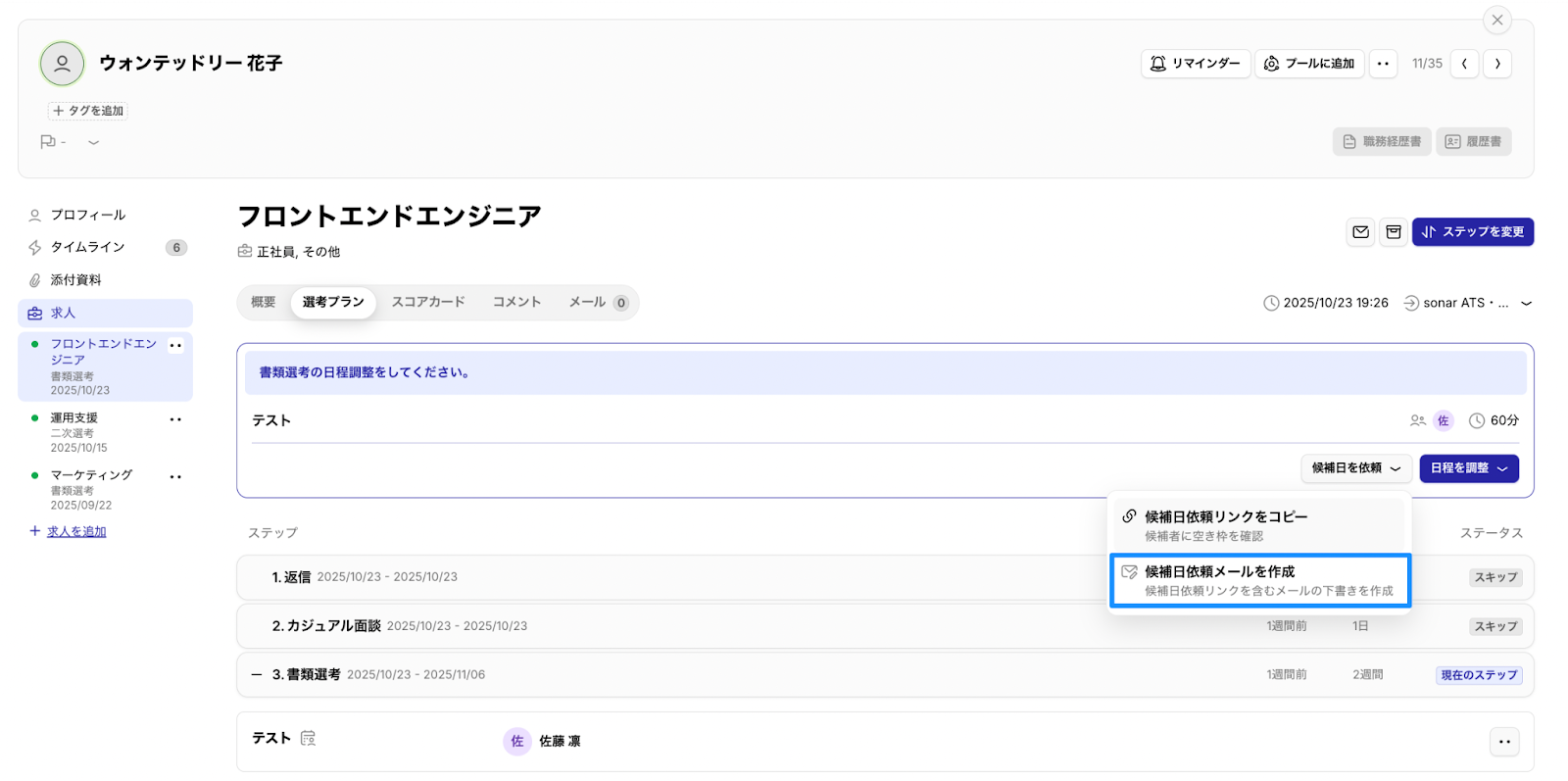 候補者に「日程調整リンク」を送付するメール作成時に選択されます