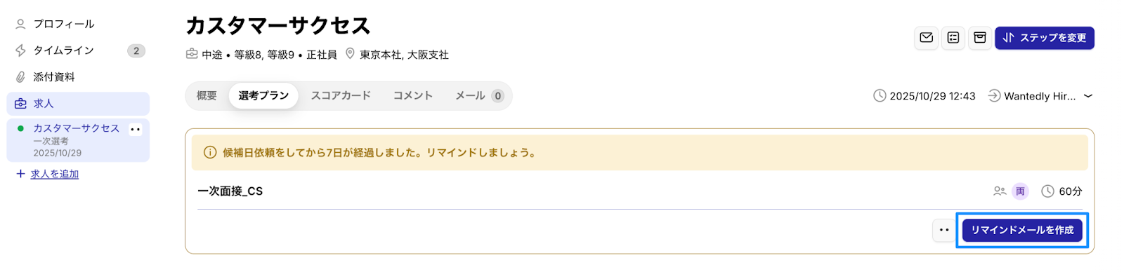 「候補日依頼リンク」を発行したが、候補者から回答がない場合に表示される[リマインドメールを作成]をクリックした場合に選択されます。