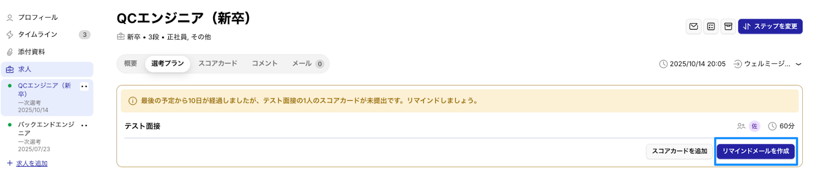 面接終了後、選考官に候補者の評価(スコアカード)を提出するよう促すリマインドメールを送る際に選択されます。