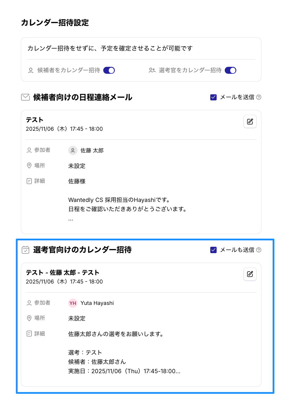 手動で日程調整時、選考官向けにカレンダー招待を送る場合に選択されます。