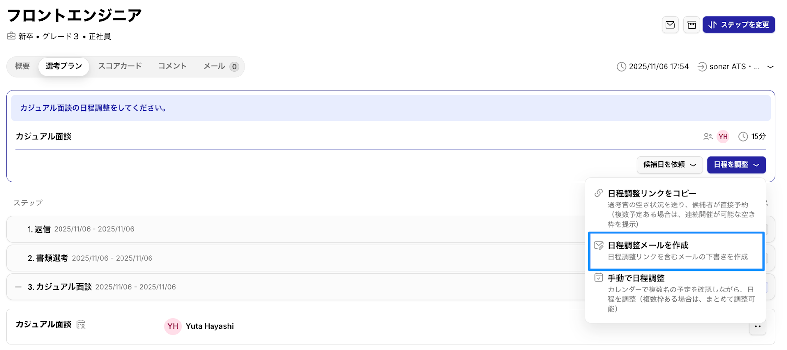 手動で日程調整時、選考官向けに日程確定メールを送る場合に選択されます。
