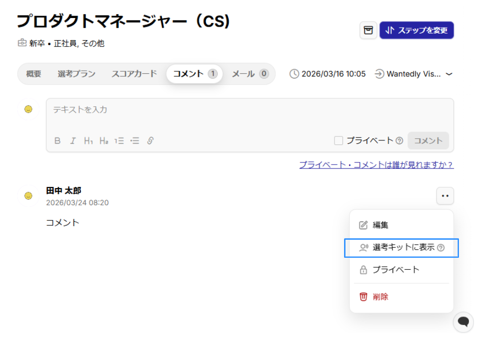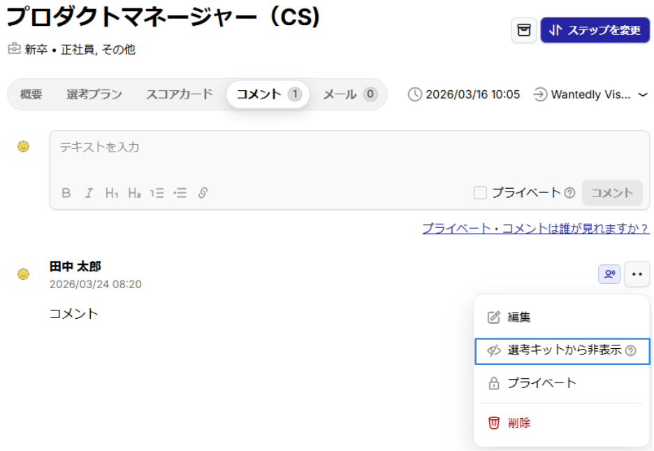 1) 候補者プロフィール内の「コメント」タブを選択し、該当コメントの右側にある [‥] アイコンをクリックする。