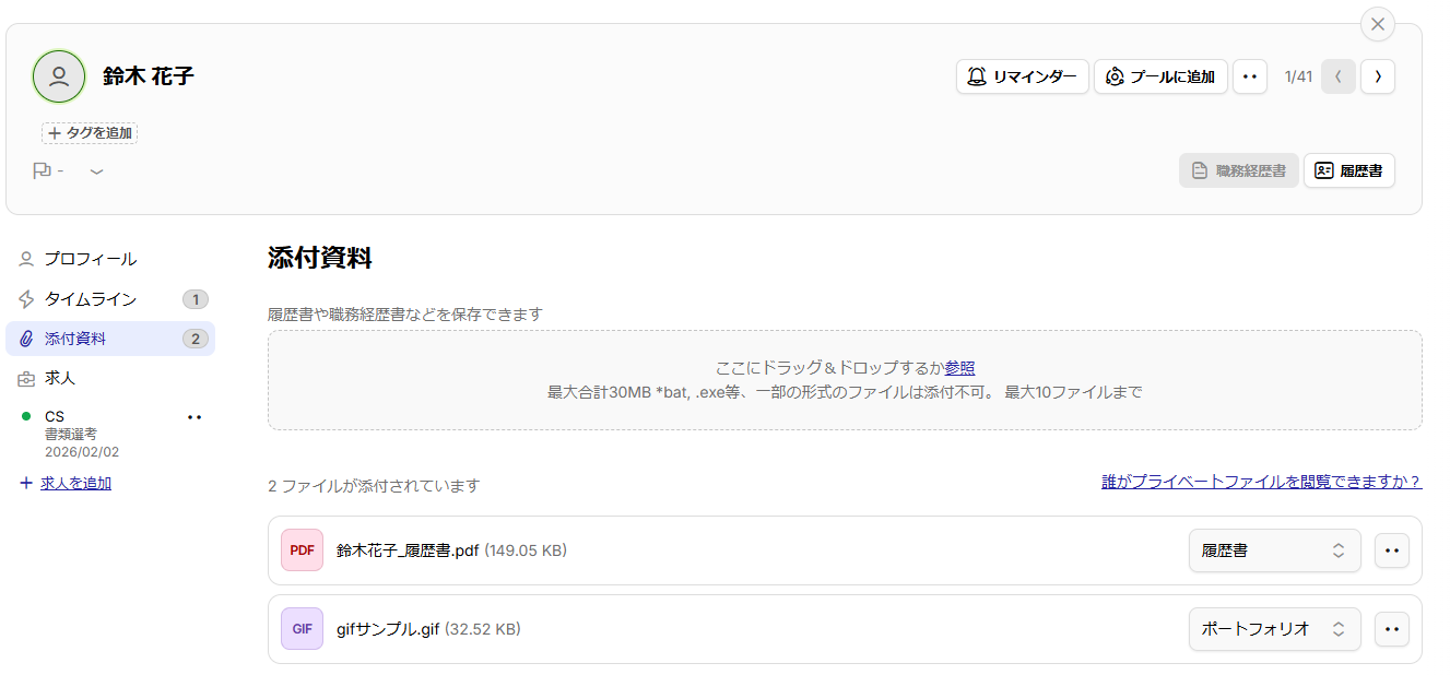 候補者に紐づく資料(職務経歴書、履歴書、ポートフォリオ等)が表示されます。