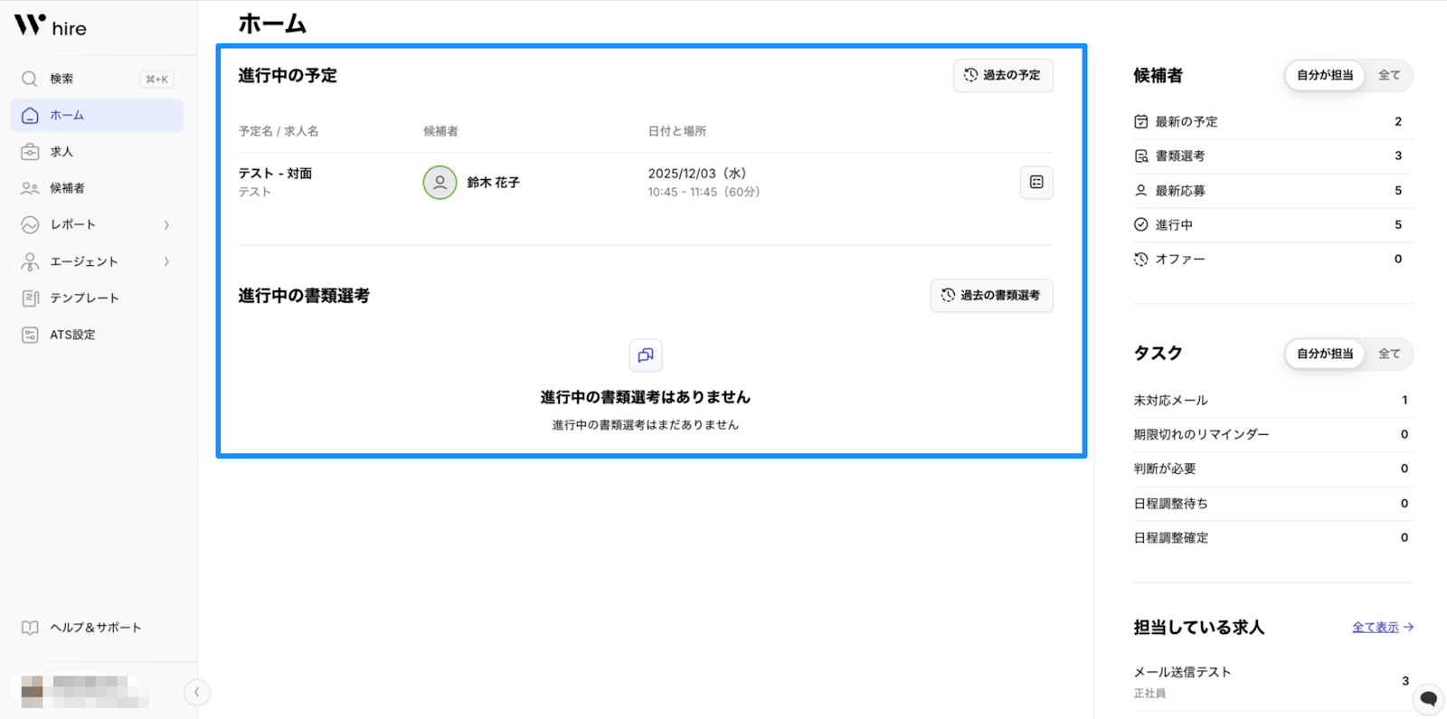 このエリアでは、採用プロセス全体の採用状況や、自身が日々対応すべきタスクが表示されます。
