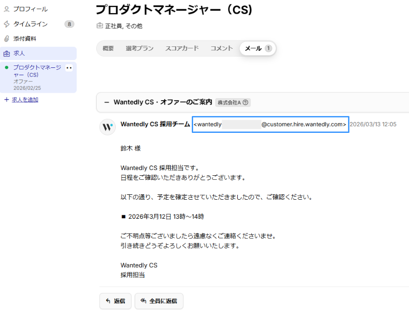- このアドレス宛に返信することで、Wantedly Hireの管理画面上の該当候補者のメッセージ履歴に、メールの内容が自動で紐付けられます。