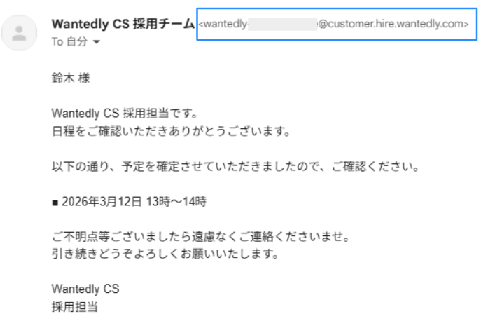 - Wantedlyから候補者へメッセージを送信した際、候補者側では「wantedly + *****@customer.hire.wantedly.com」のような、その候補者専用のアドレスが送信元として表示されます。