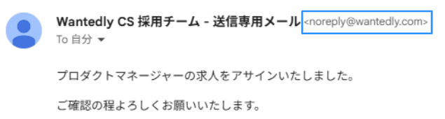 候補者とは異なり、エージェント宛のメールアドレスは共通して「noreply@wantedly.com」が使用されます。