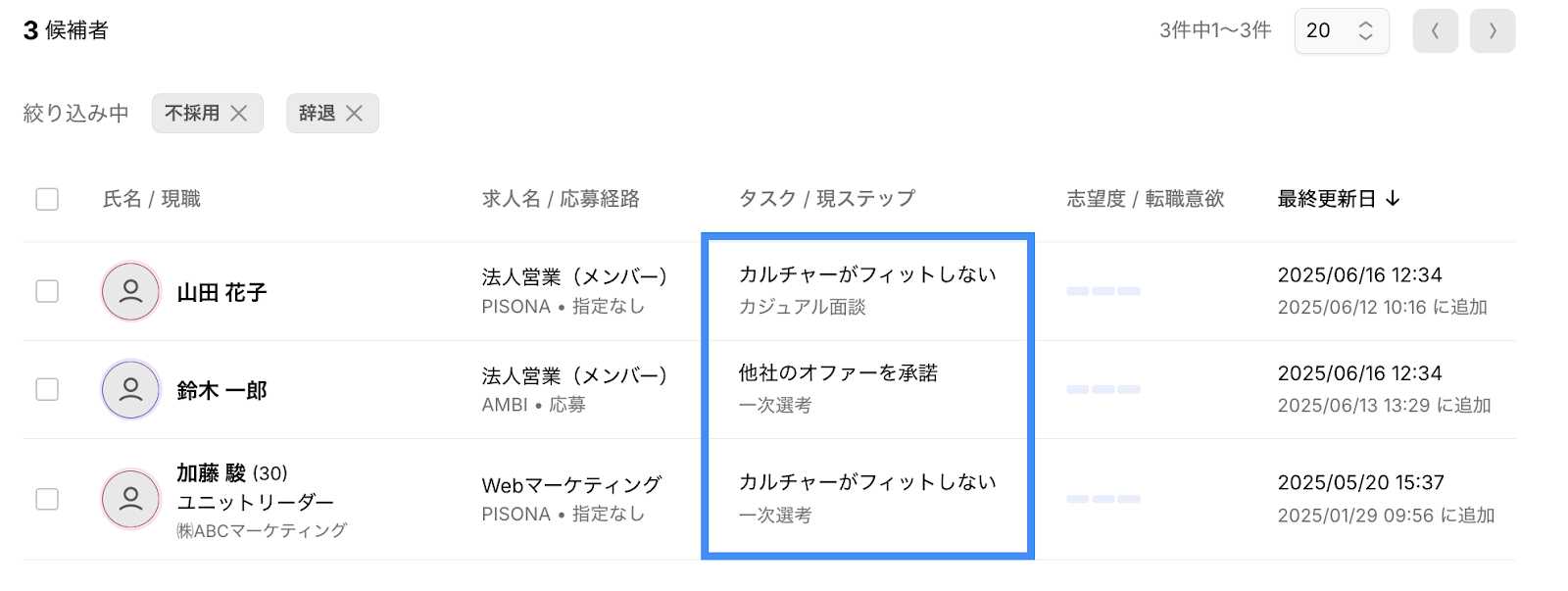 プロセス終了済みの候補者の行には[タスク/現ステップ]の代わりに[プロセス終了理由/サブカテゴリ]が表示されております。