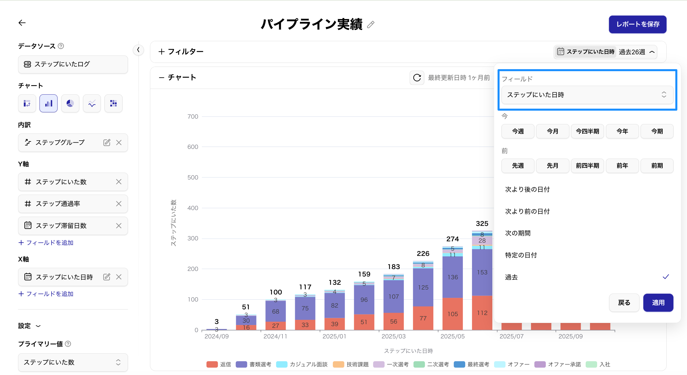ステップ変更ログとほぼ同じですが、このログを選択すると時刻フィールド「ステップにいた日時」が選択できます。