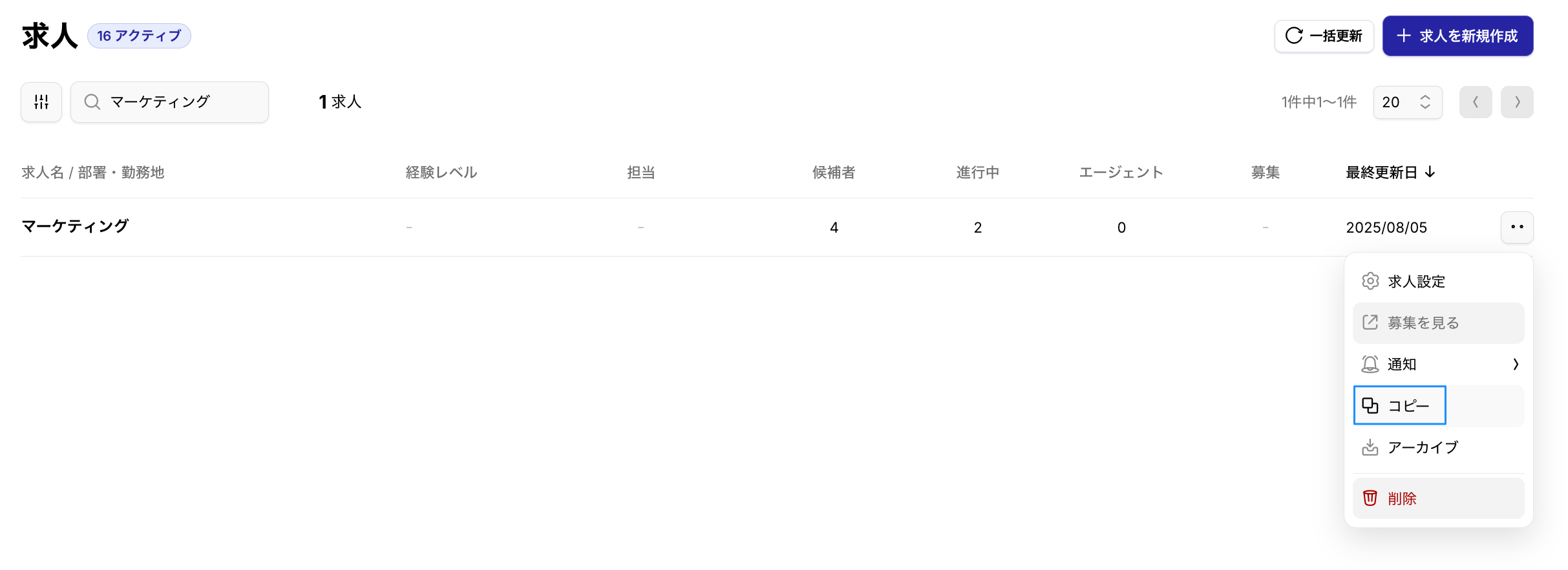 2025/08/05-【アップデート】求人のコピー作成時に、コピー先の求人に反映される項目が増えました 更新 2025年08月08日 07:52 カテゴリー求人対象プラン全プラン求人のコピーを作成すると、以下の項目がコピー先の求人に反映されるようになりました。求人基本情報選考プランと採用基準選考メモデフォルト・アクション募集要項(コピー元の値に関わらず、掲載状況は全て非公開で作成される)応募フォーム※求人へのアクセス権限はコピーされません。
