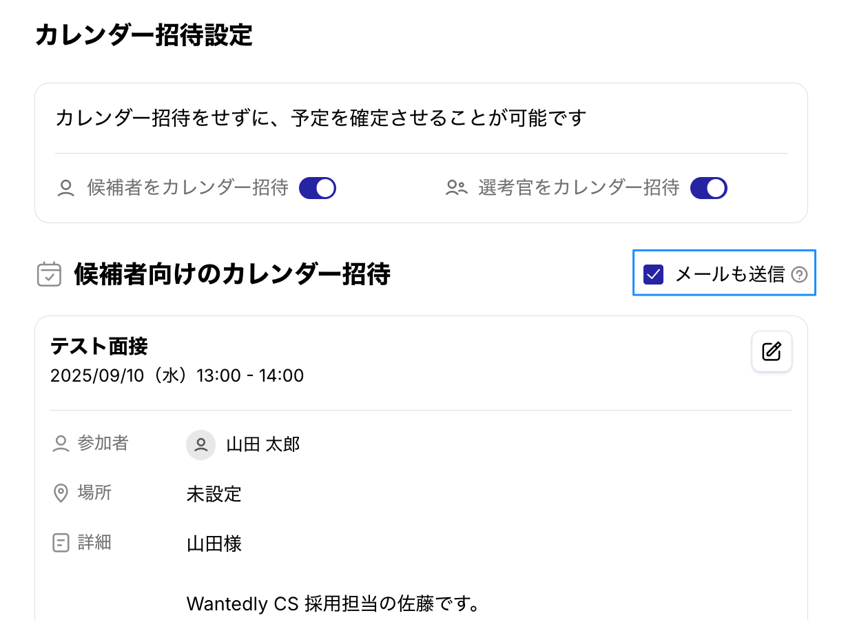 候補者及び選考官にカレンダー招待・メール送信を行うか選択できます。