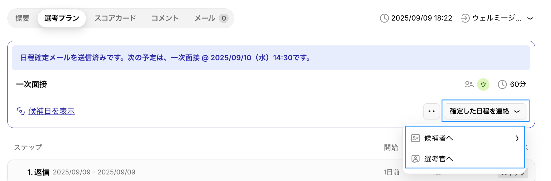 日程確定後、[確定した日程を連絡] より連絡いただくか、