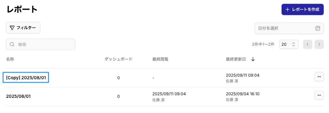 レポート一覧画面、編集画面から作成したレポートのコピーを作成できるようになりました。