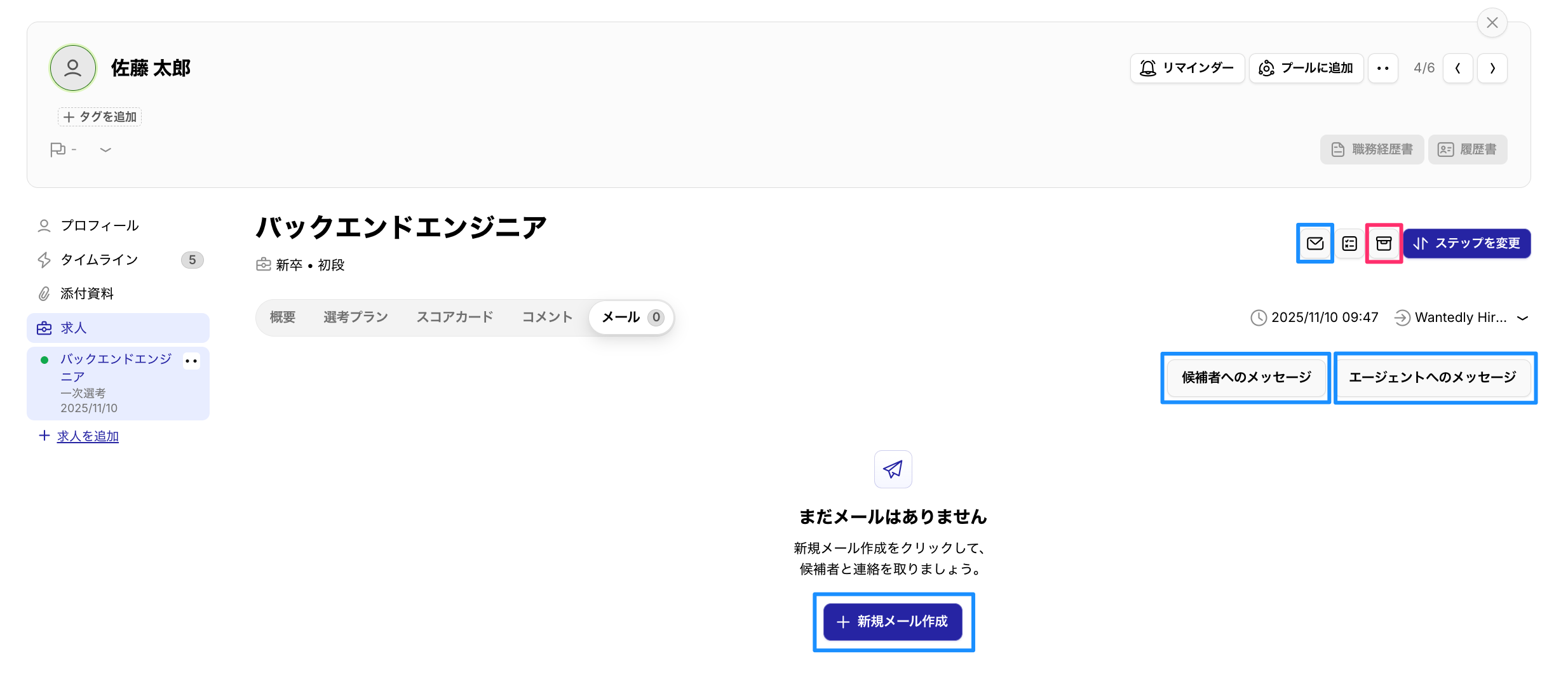 Wantedly Hireでは、複数の箇所でメールを作成・送信できます。