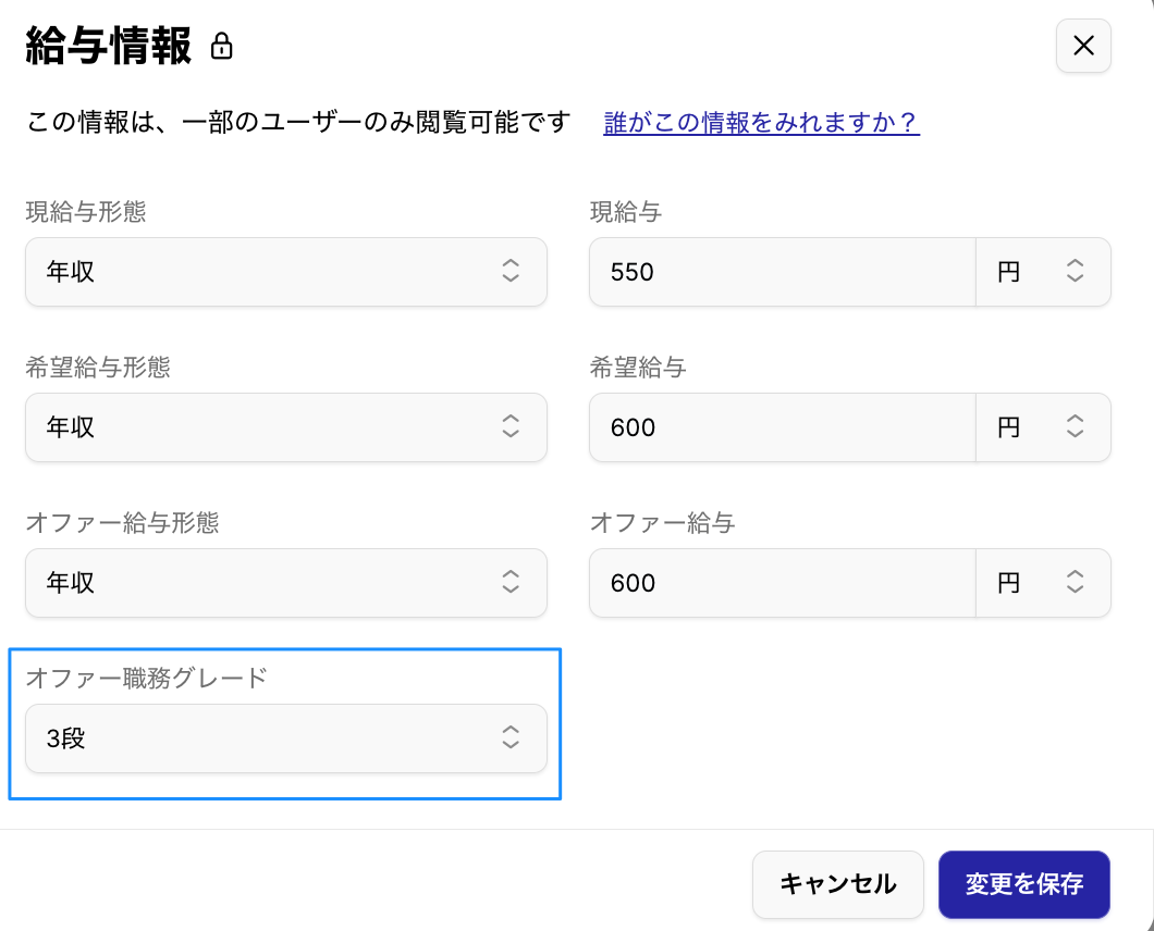 候補者の給与情報欄に「オファー職務グレード」を入力できるようになりました。
