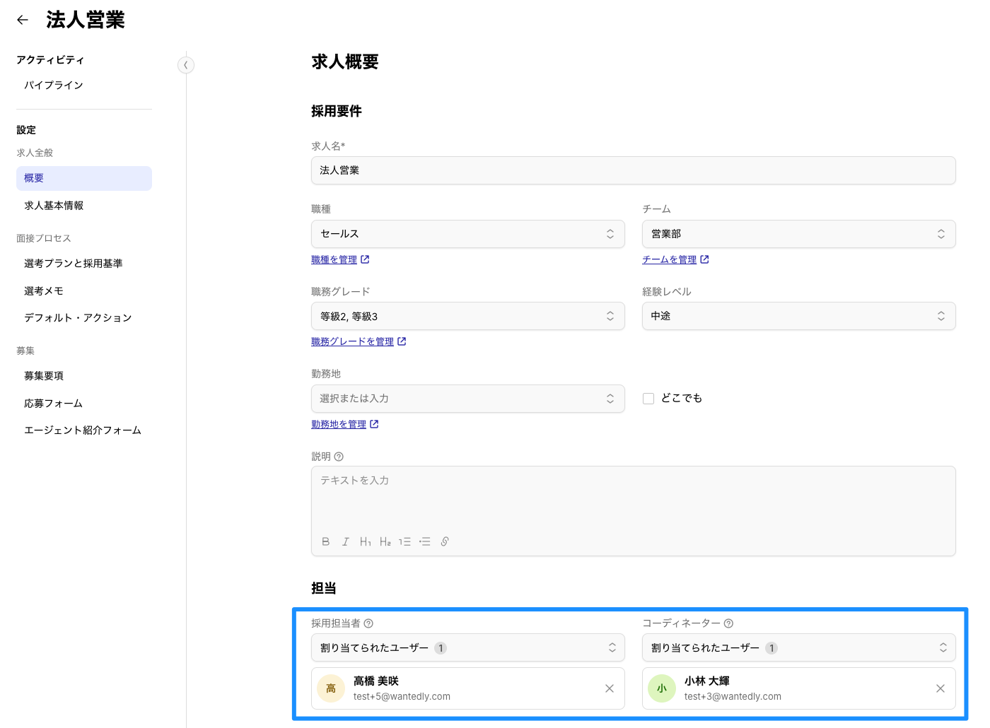 ▼求人の「採用担当者」「コーディネーター」の設定画面