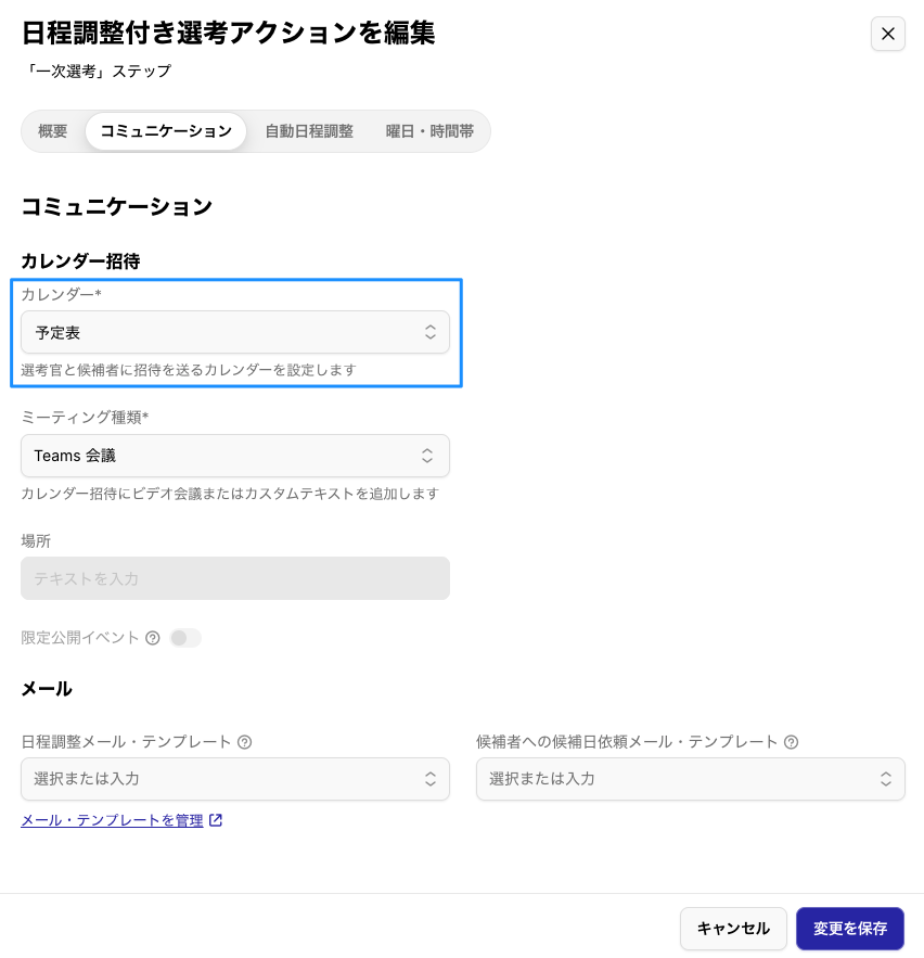 - Microsoft 365連携解除前に選考日程が確定して登録されたOutlookカレンダーは、Microsoft 365再連携後に選考日程調整を行っても、元のOutlookカレンダーは削除されません。