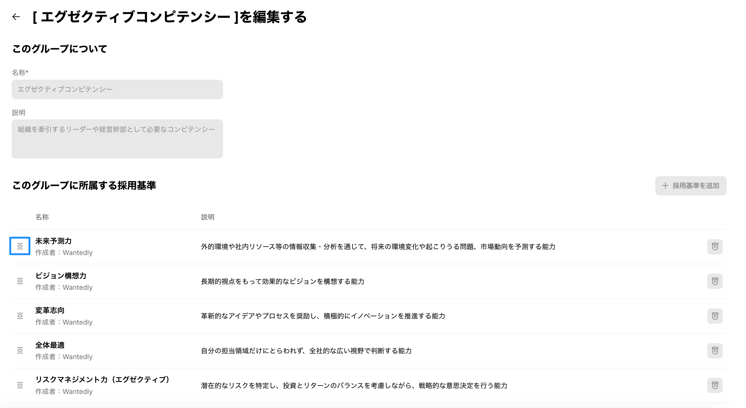 2025/11/21 ‐【アップデート】採用基準の並び替えができるようになりました。 更新 2025年11月26日 11:31 カテゴリーATS設定対象プラン全プラン採用基準の並び替えができるようになりました。ATS設定 > 採用基準 > 採用基準グループ > 編集 の手順で採用基準を並び替えると、その順番がスコアカード記入画面に即時反映されられます。