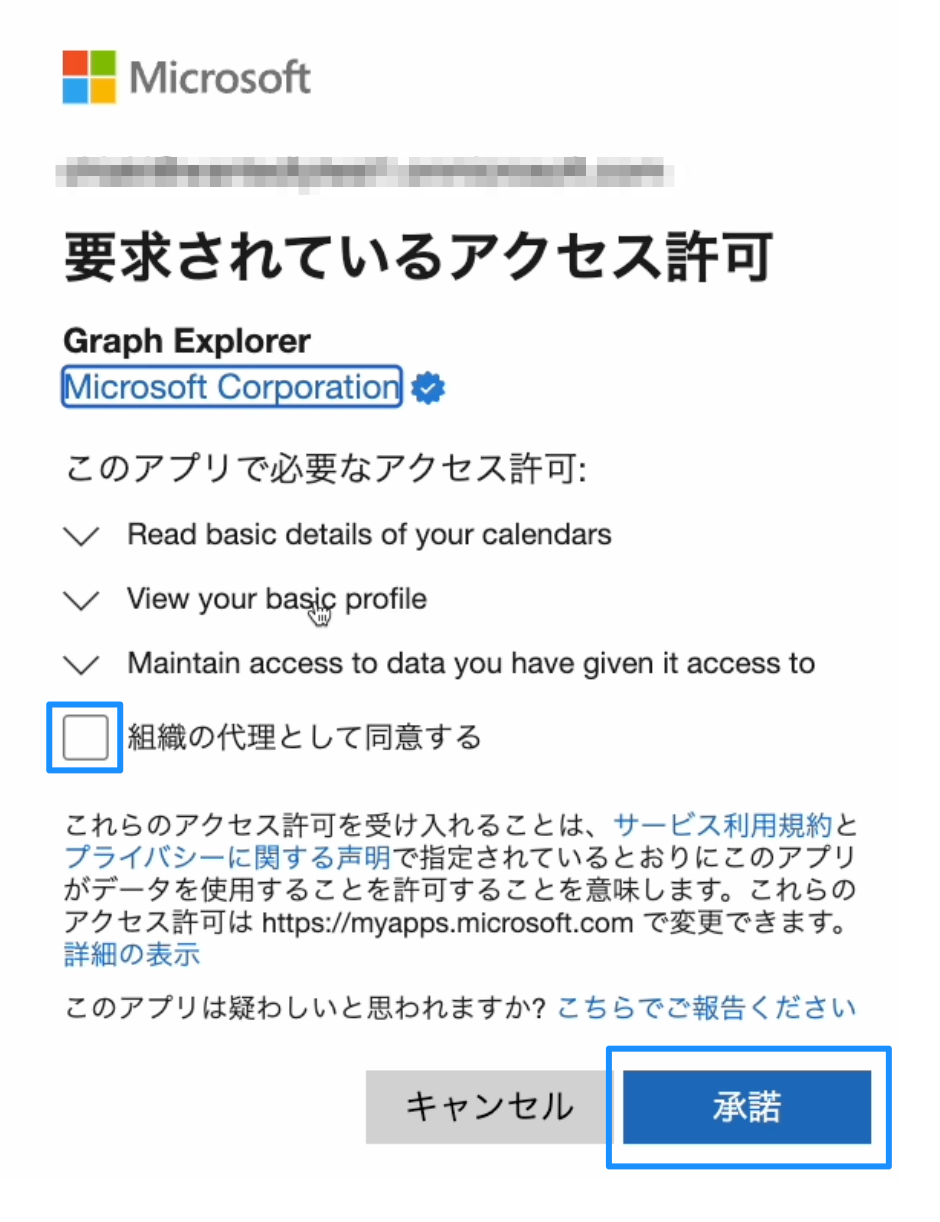 a)[組織の代理として同意する]左横にチェックし、[承諾]をクリックする