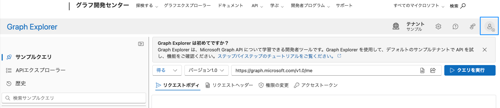 3)画面中央のURLを「https://graph.microsoft.com/v1.0/me/calendars」に書き換え、[クエリを実行]をクリックする