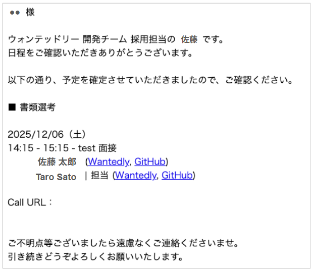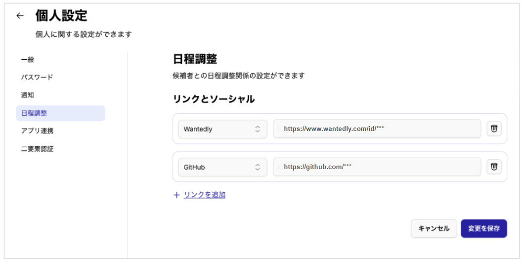 個人設定画面または組織設定画面にて各種SNSのリンクを設定することで「次の面談・面接スケジュール」のメール変数内に自動反映させることができます。