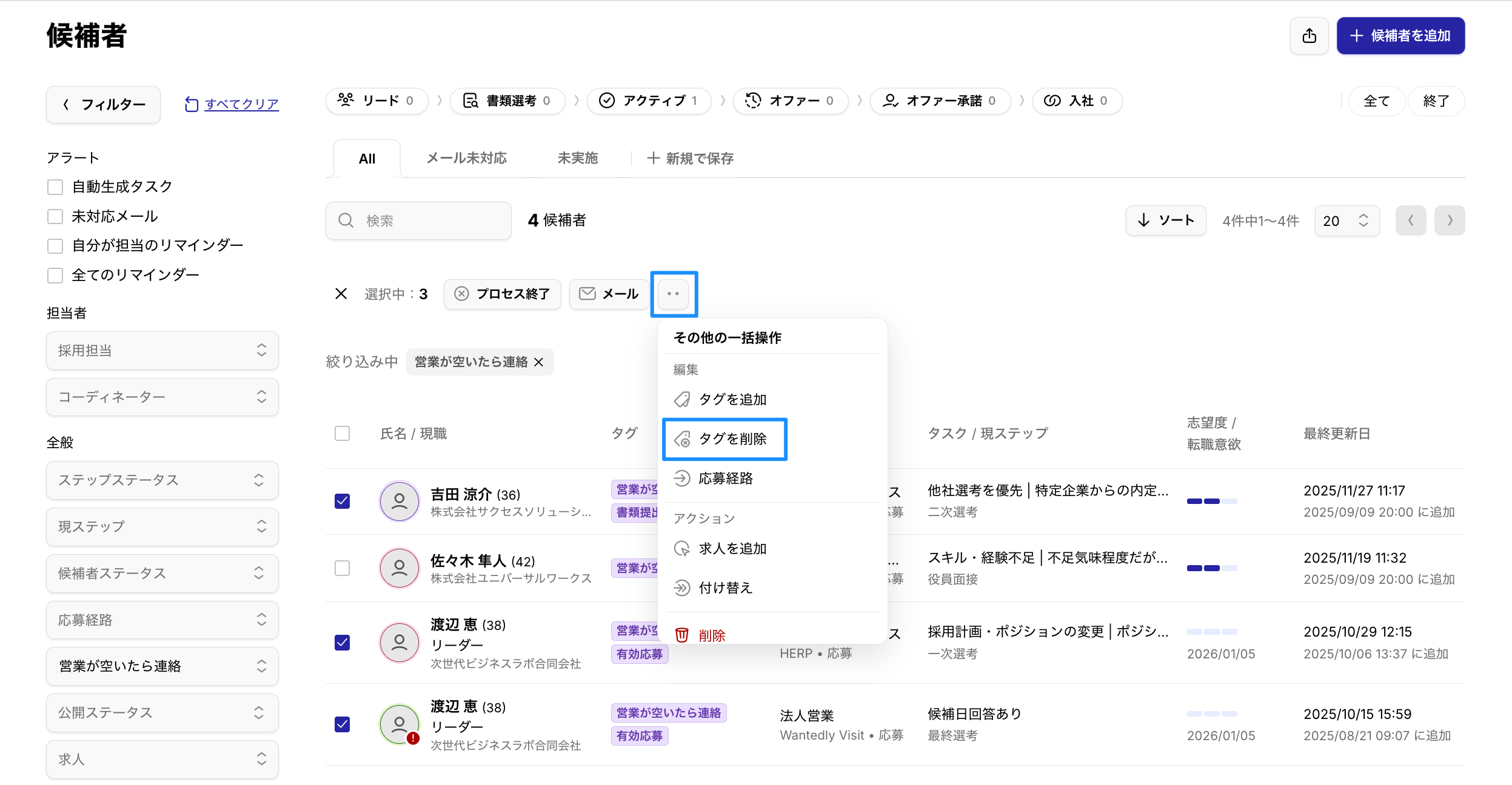 2025/12/22 - 候補者一覧にてタグを一括削除する機能がリリースされました 更新 2026年01月15日 01:52 カテゴリー候補者一覧対象プラン全プラン候補者一覧ページにて、選択した候補者のタグを一括で削除できるようになりました。