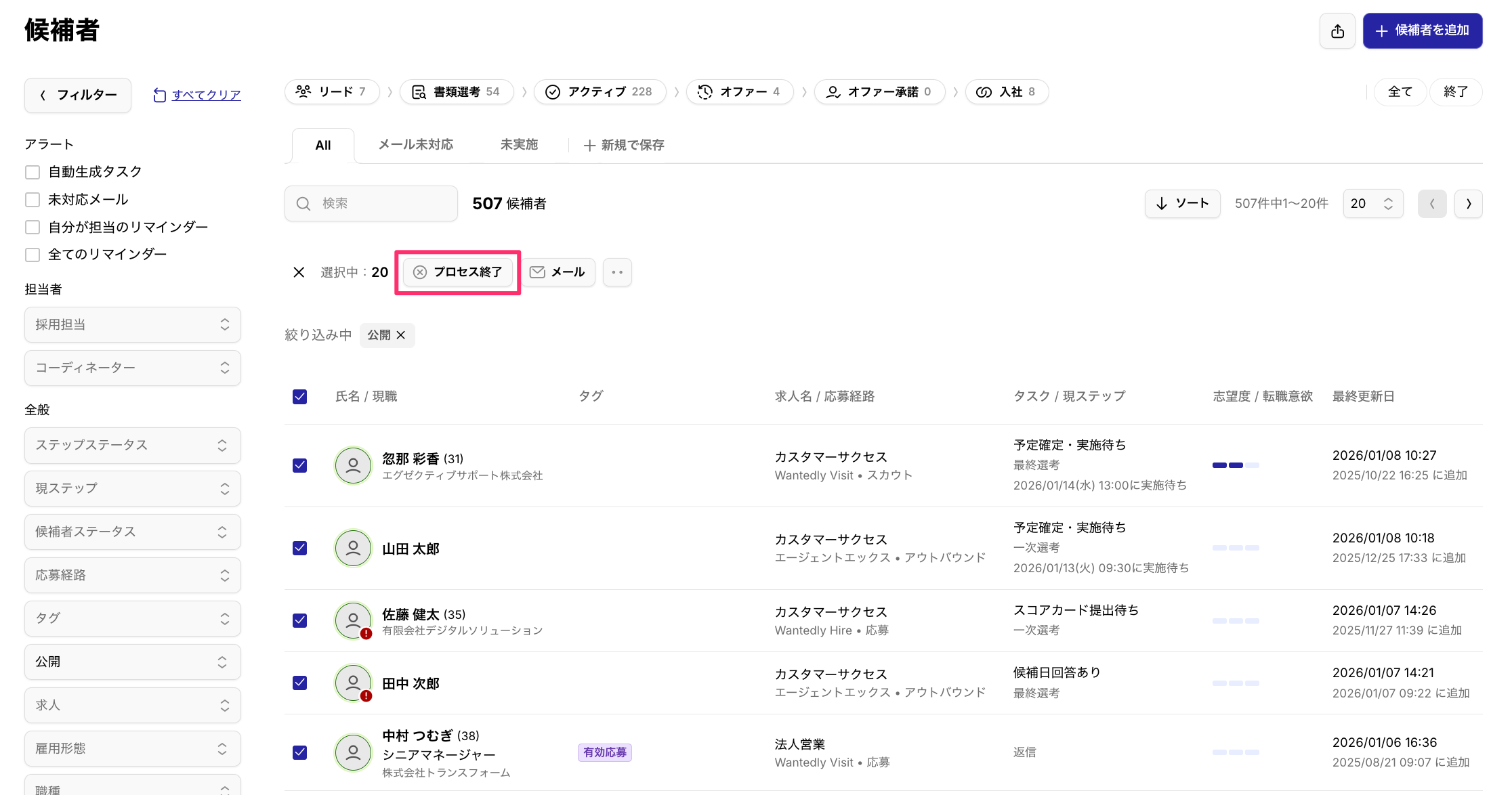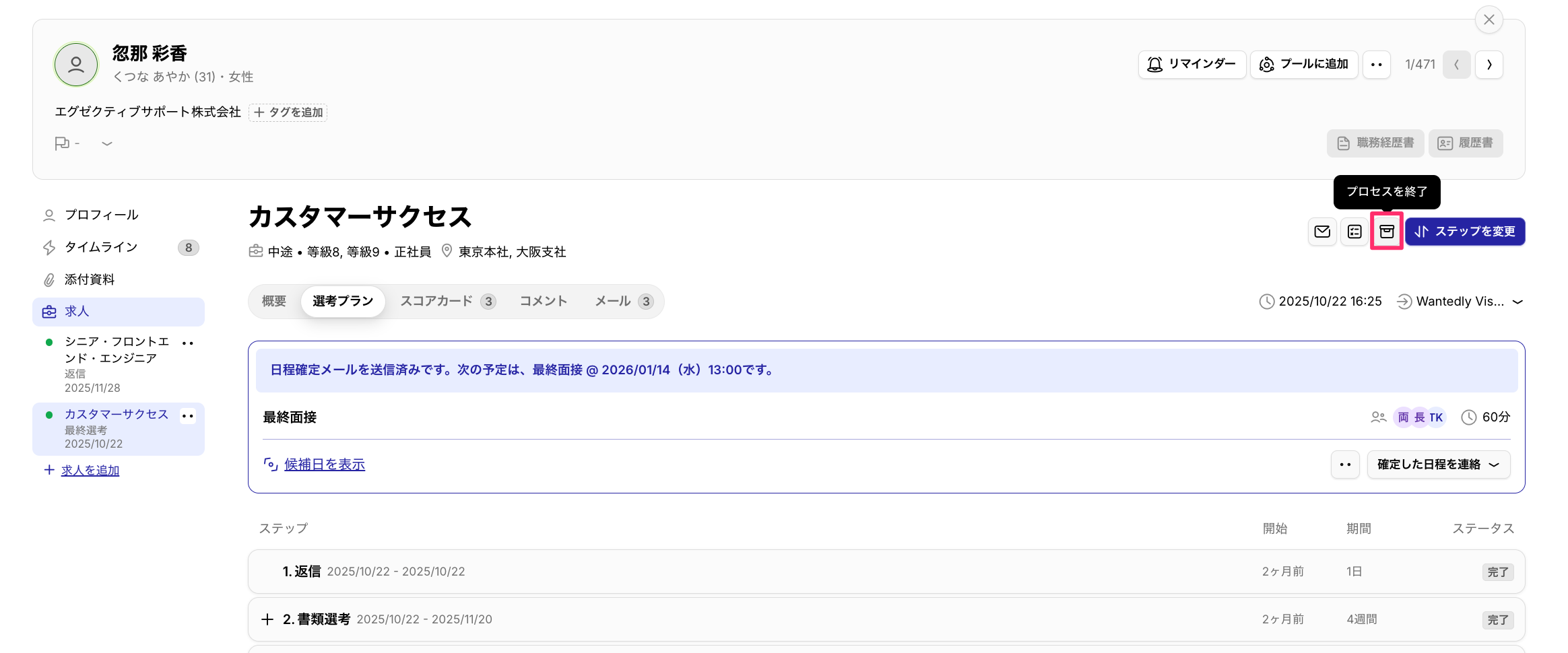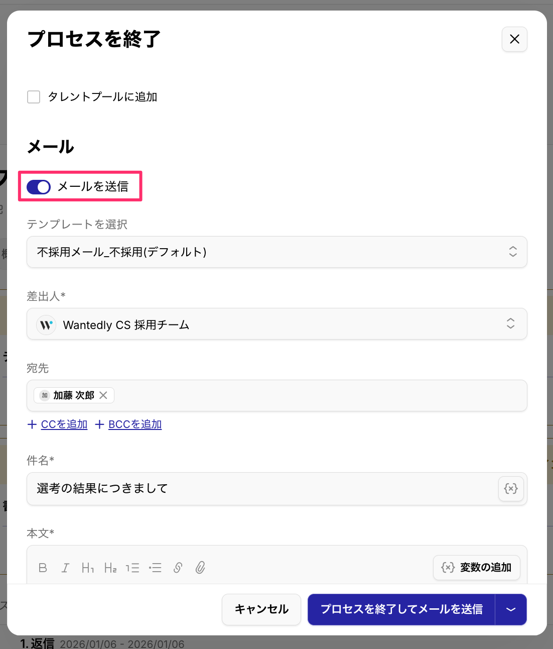 2026/1/8 - 選考プロセス終了時の「メールを送信」のON / OFFについて、前回の設定を引き継いで表示されるようになりました。 更新 2026年01月08日 02:04 以下の選考プロセスを終了する場面において、「メールを送信」のON / OFFについて前回の設定を引き継いで表示されるようになりました。 候補者一覧 > [プロセス終了] 候補者ページ > [プロセス終了] ▼[メールを送信]トグル
