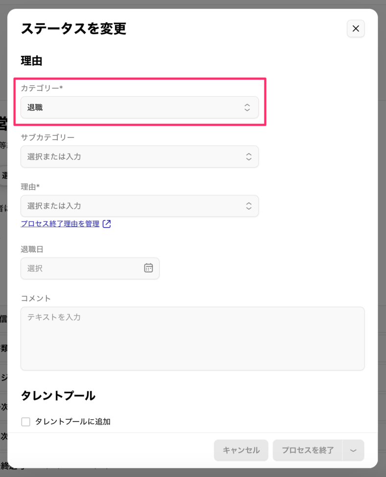 他、各所でプロセス終了理由に「退職」が追加されました。