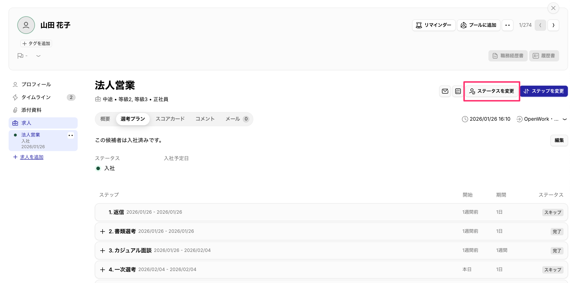 - 「入社」ステップに進み、「入社」でプロセス終了した候補者について、ステータスを変更でき、「退職」を選択できます。