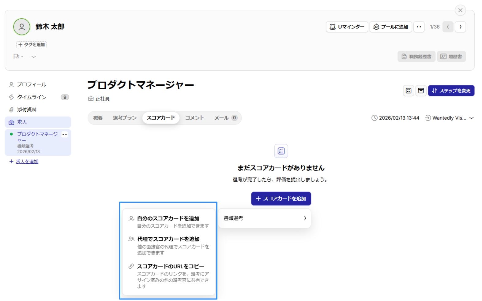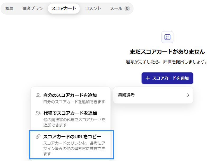 - 自身が選考官としてアサインされている場合に表示され、スコアカードを追加できる。