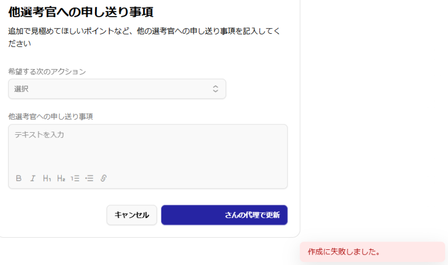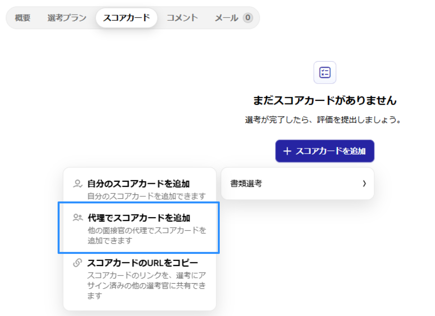- 自分以外のユーザーが選考官としてアサインされている場合に表示され、代理でスコアカードを追加できる。