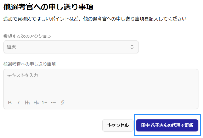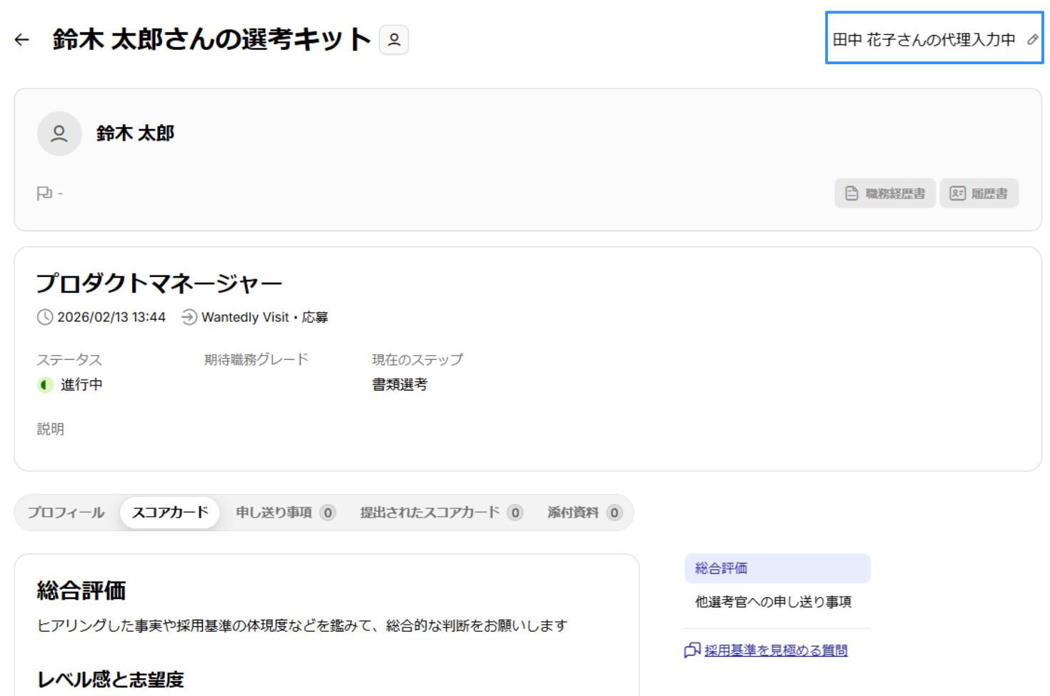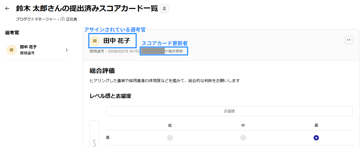 代理入力後、スコアカード上部には選考官の名前が表示され、最終更新者として代理入力したユーザー名が表示されます。