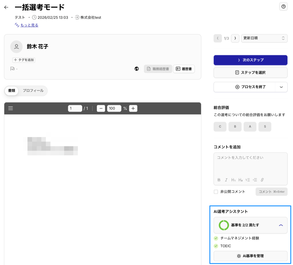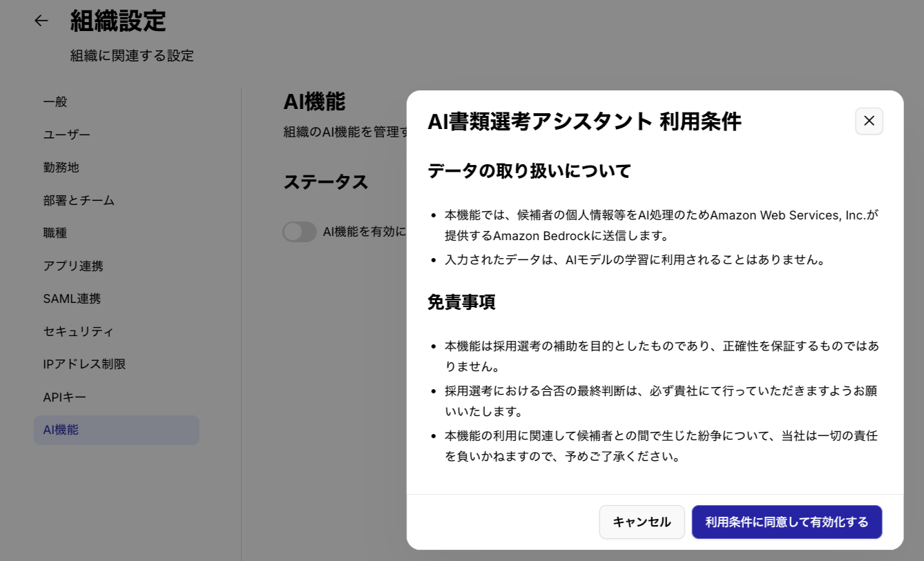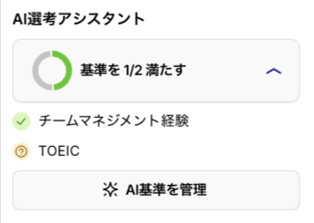 AI書類選考アシスタントは、AIが候補者の書類をチェックし、事前に設定した選考基準を満たしているかを判定する機能です。
