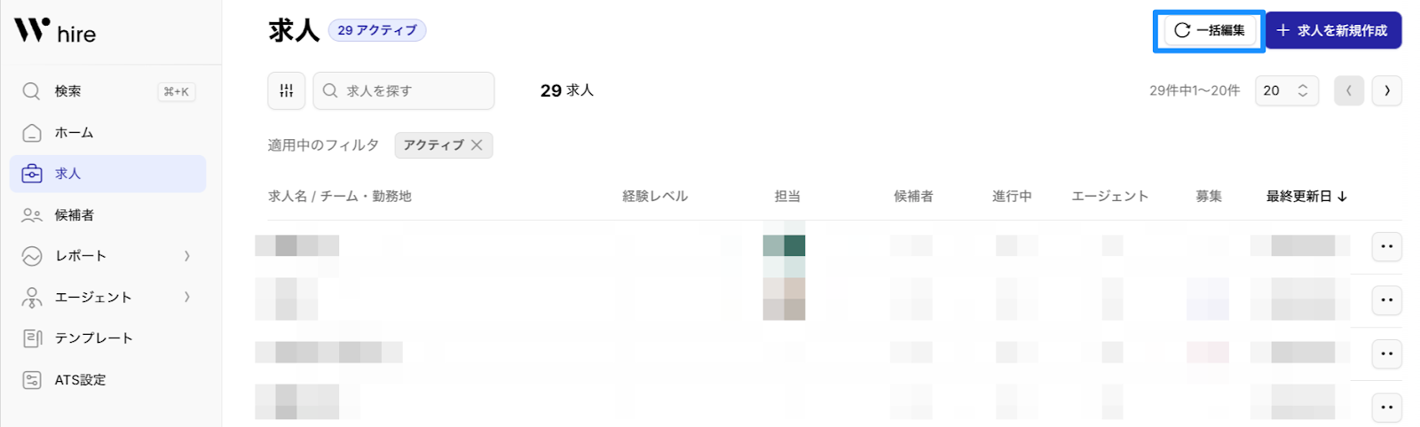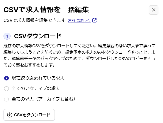 - 求人情報:[求人] > [一括編集] > [CSVをダウンロード]
