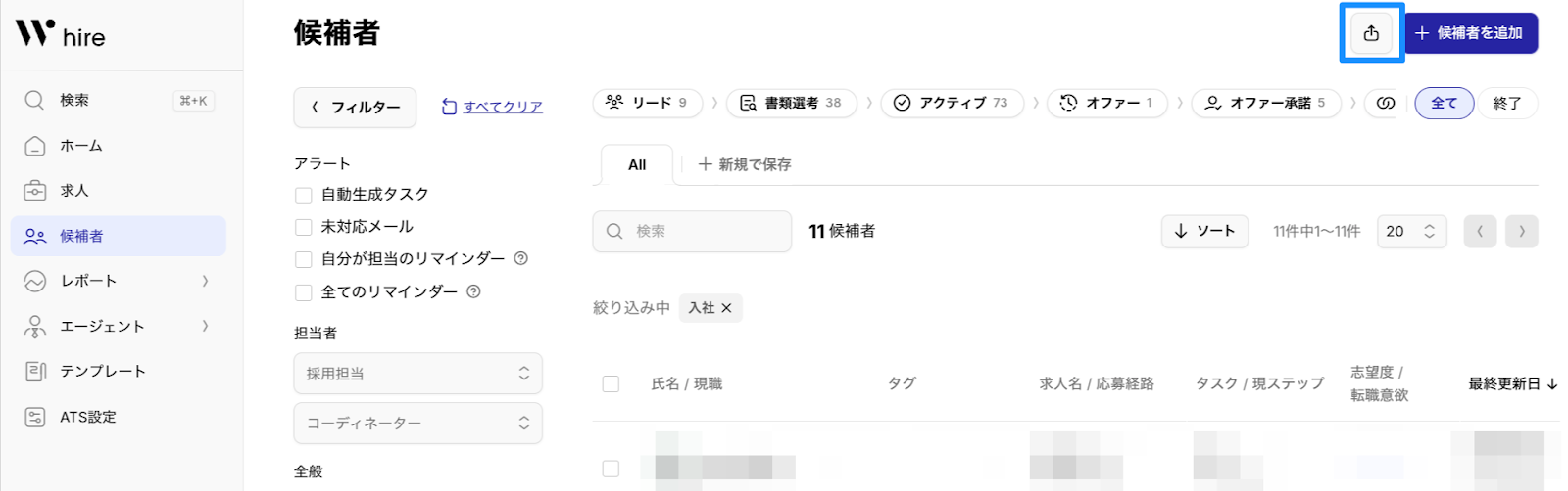 - 候補者情報:[候補者] > 画面右上の [候補者をエクスポート] > [エクスポート]