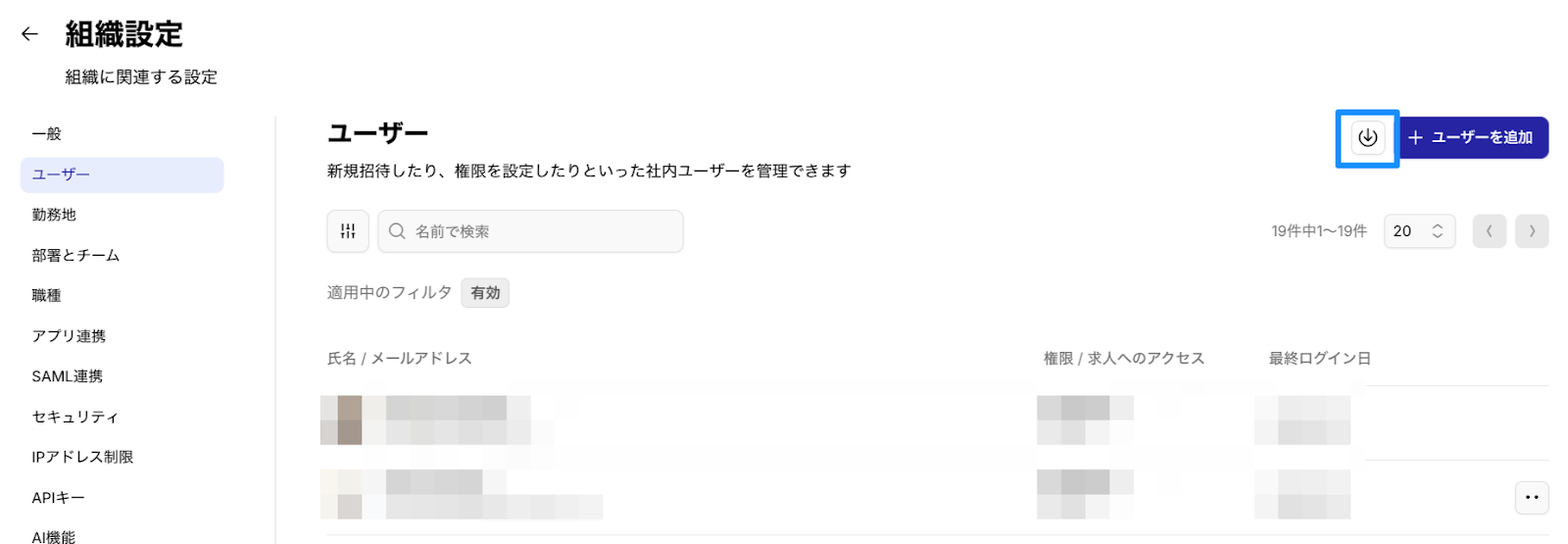 - ユーザー情報: [組織設定] > [ユーザー] > 画面右上の [ユーザー情報をエクスポート]