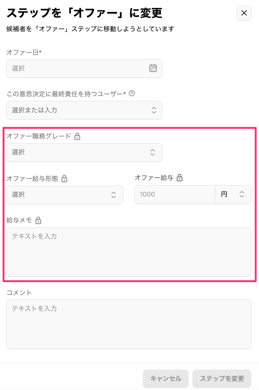 2026/3/13 - 「オファー」ステップに遷移するときの入力項目を追加しました。 更新 2026年03月16日 08:23 候補者詳細 > 求人タブ > ステップを変更 にてオファーを選択した際の入力ウィンドウに以下の項目を追加しました。職務グレード給与形態給与給与メモ