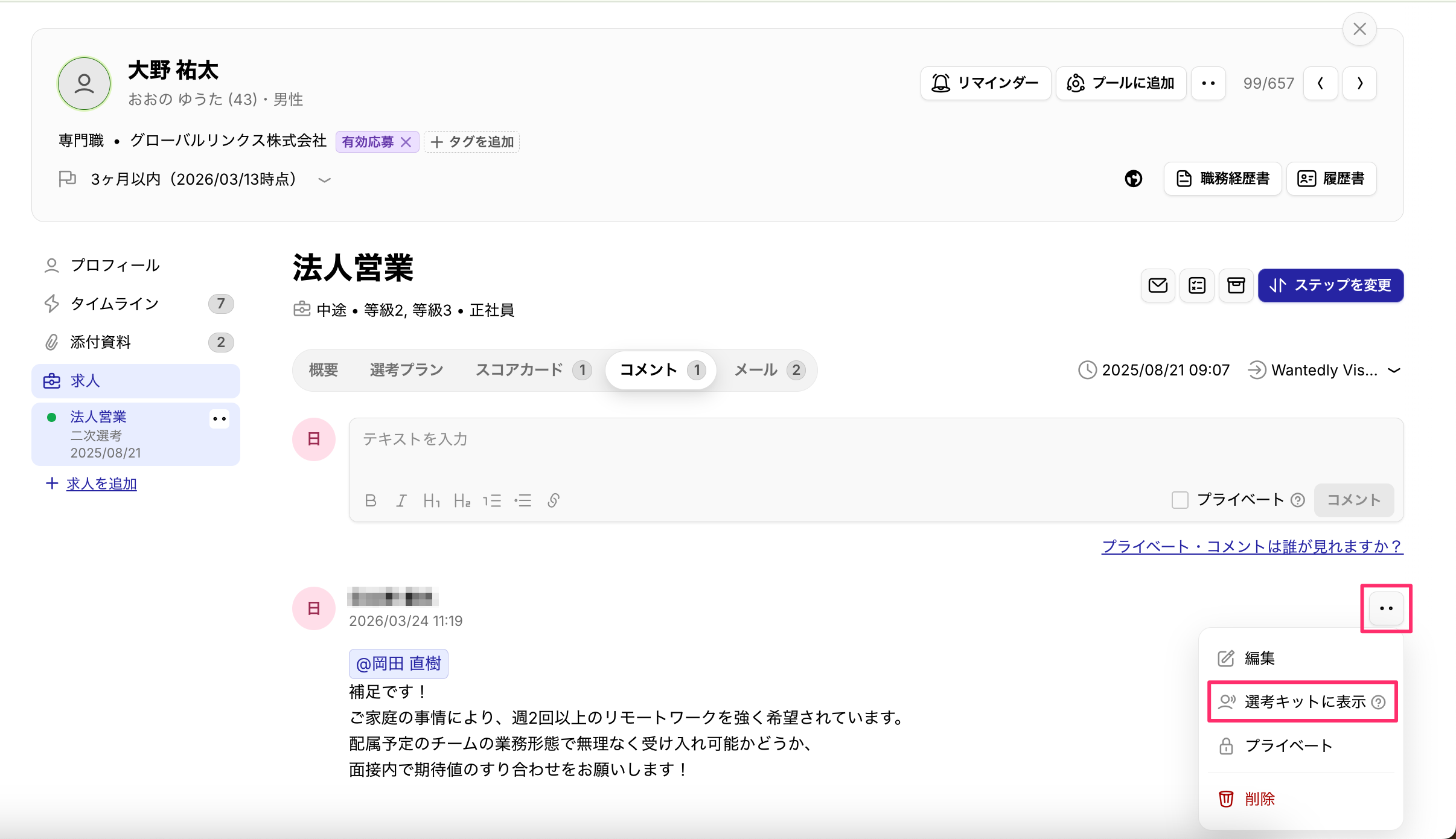 ※プライベート化されたコメントは、[選考キットに表示]を選択しても