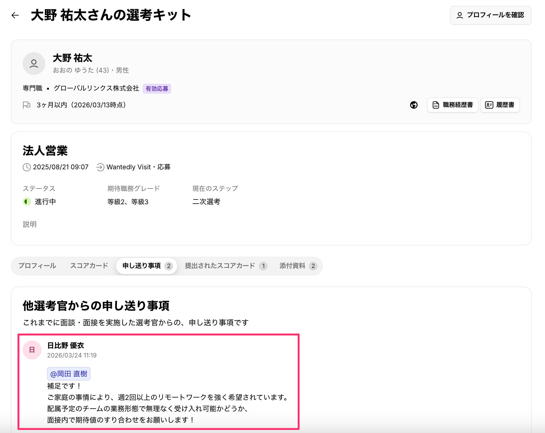 その候補者へのアクセス権のあるユーザーであれば、誰でも申し送り事項をスコアカードに