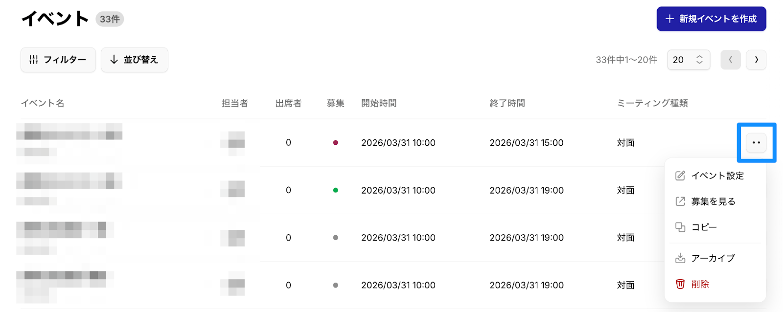 1) [イベント] > 該当イベントの右側にある [‥] をクリックして操作します。