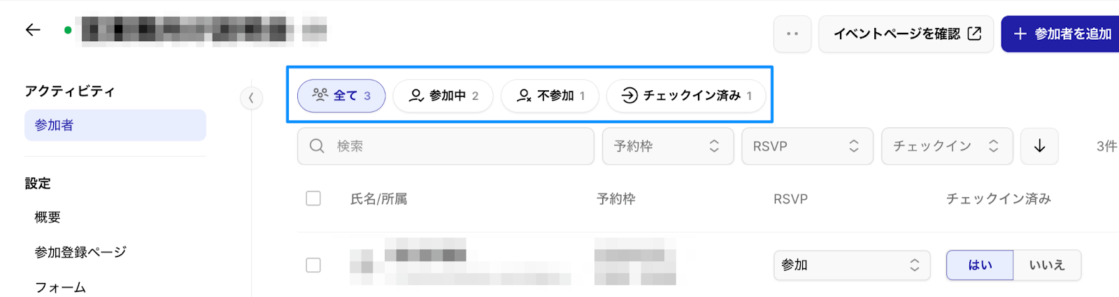 [イベント] > 該当のイベント行をクリックすると、そのイベントの参加者一覧画面が表示されます。