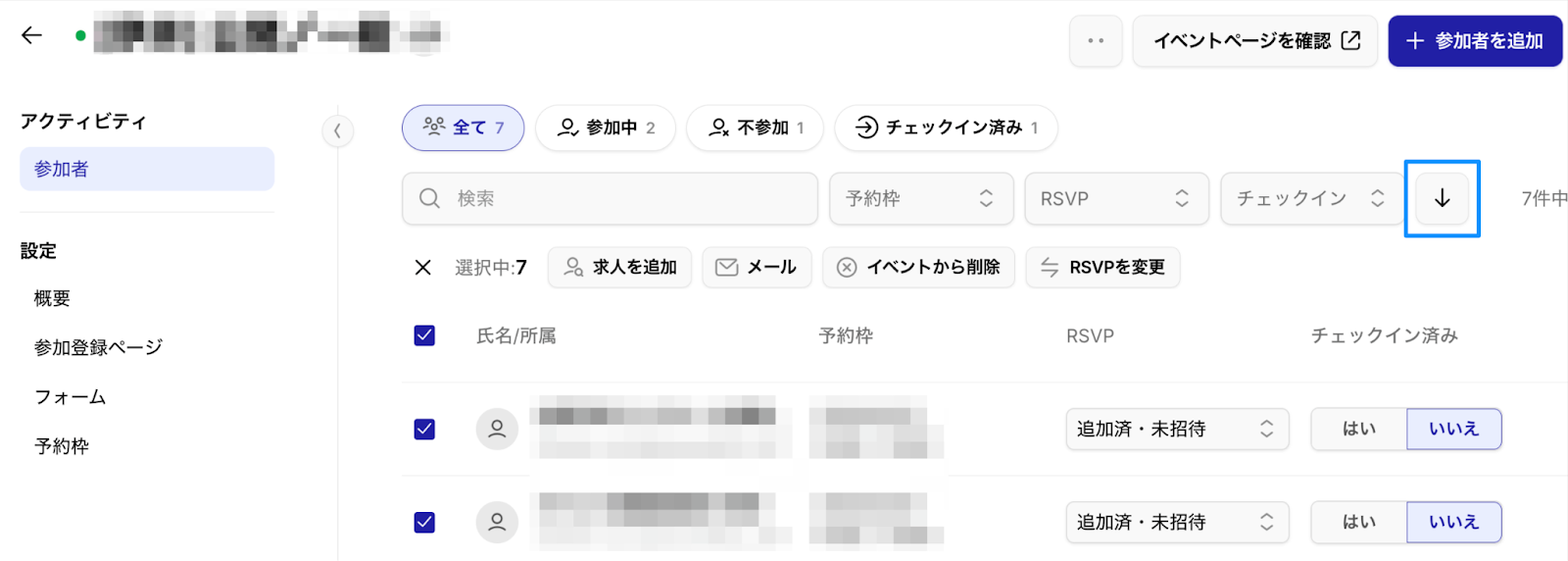参加者一覧画面の右上にある [↓] をクリックすると、並び替え項目を選択後昇順・降順を切り替えられます。