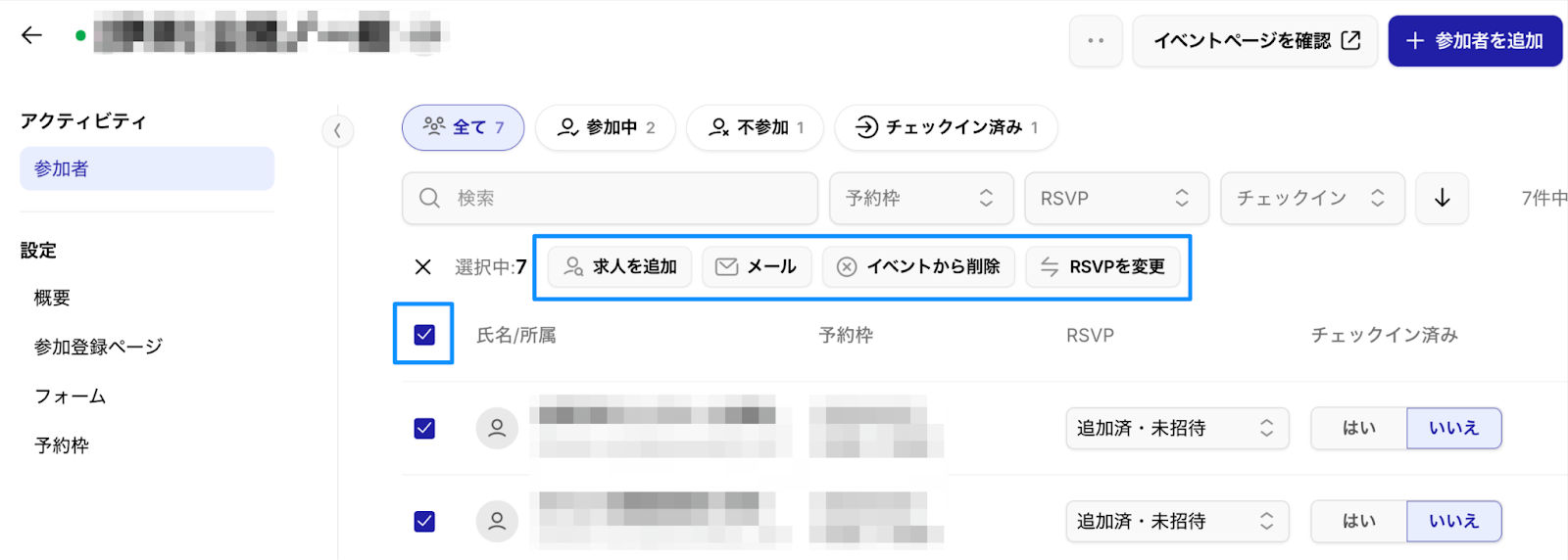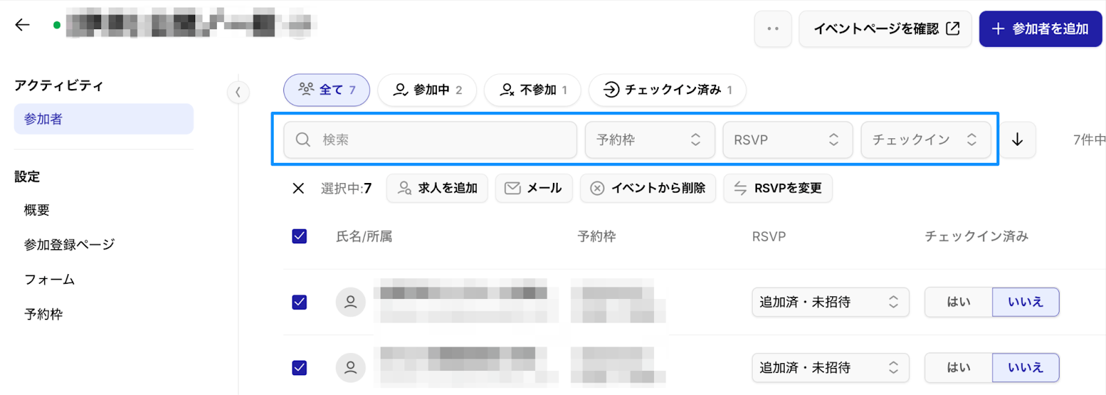 予約枠や参加ステータス等による参加者の絞り込みが可能です。