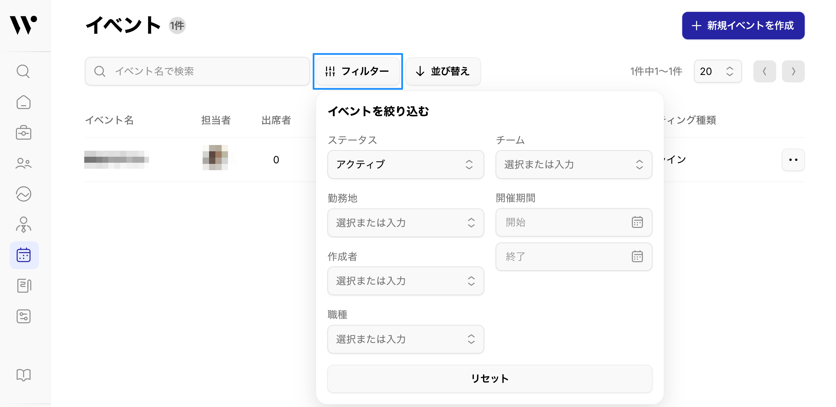イベント一覧画面の左上にある [フィルター] をクリックすると、ステータスや開催期間等によるイベントの絞り込みが可能です。