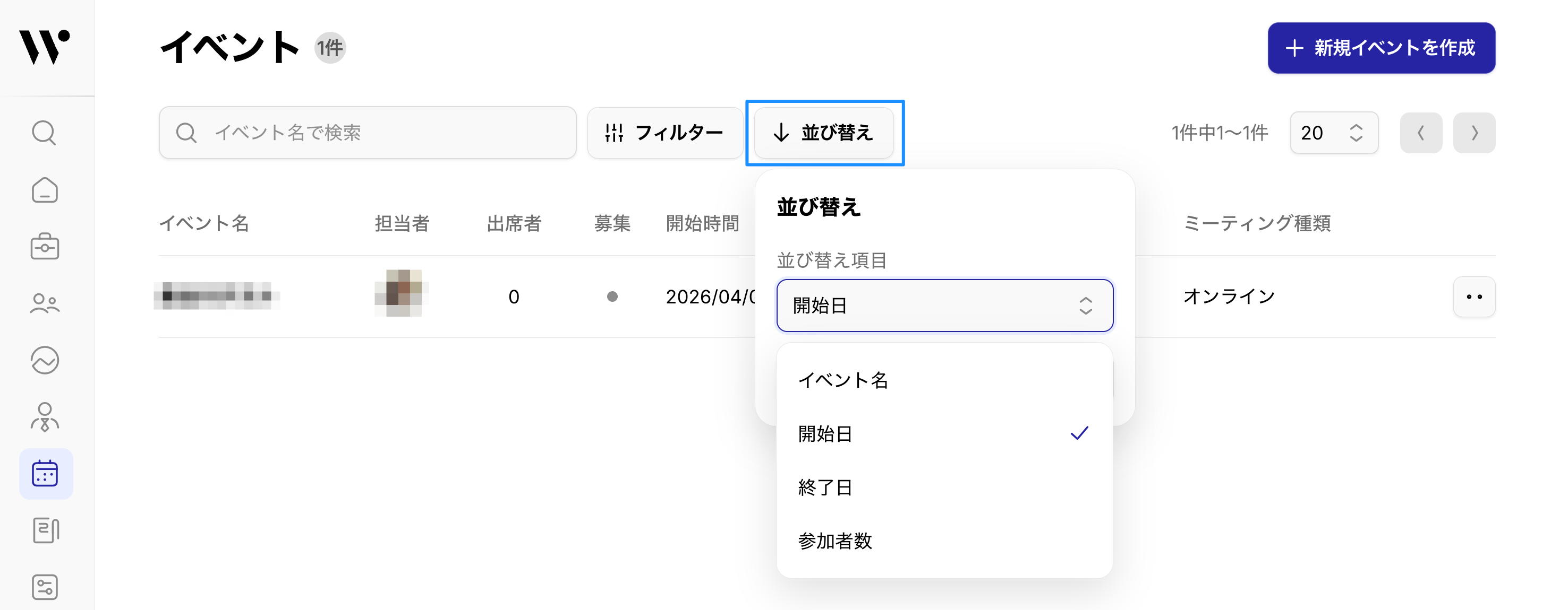 イベント一覧画面の左上にある [並び替え] をクリックすると、並び替え項目を選択後昇順・降順を切り替えられます。