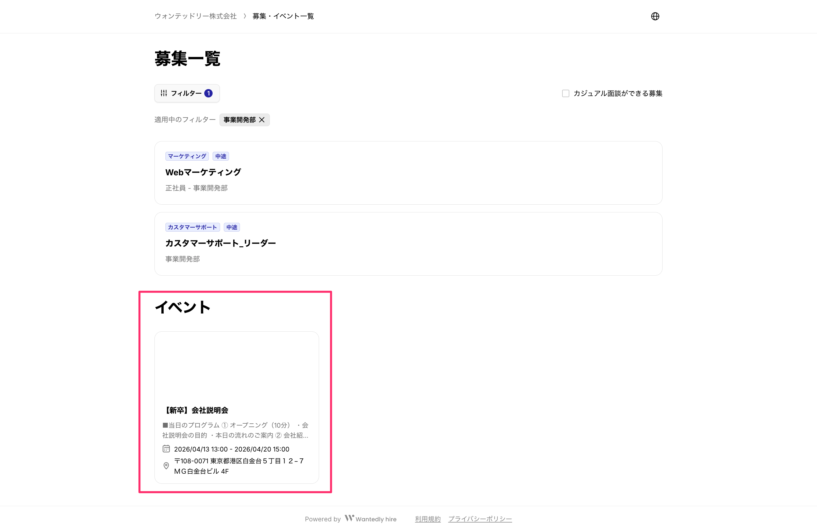 ▼イベント募集ページ(「募集一覧」ページにイベント募集掲載用のセクションが表示されます。)