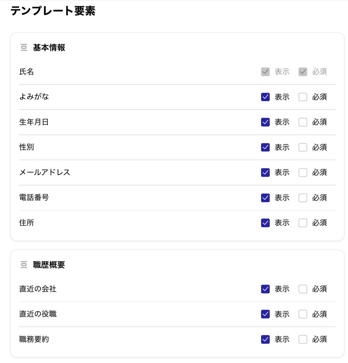 応募フォームで表示される項目は、選択したテンプレートで「表示」と設定されたセクションのみです。