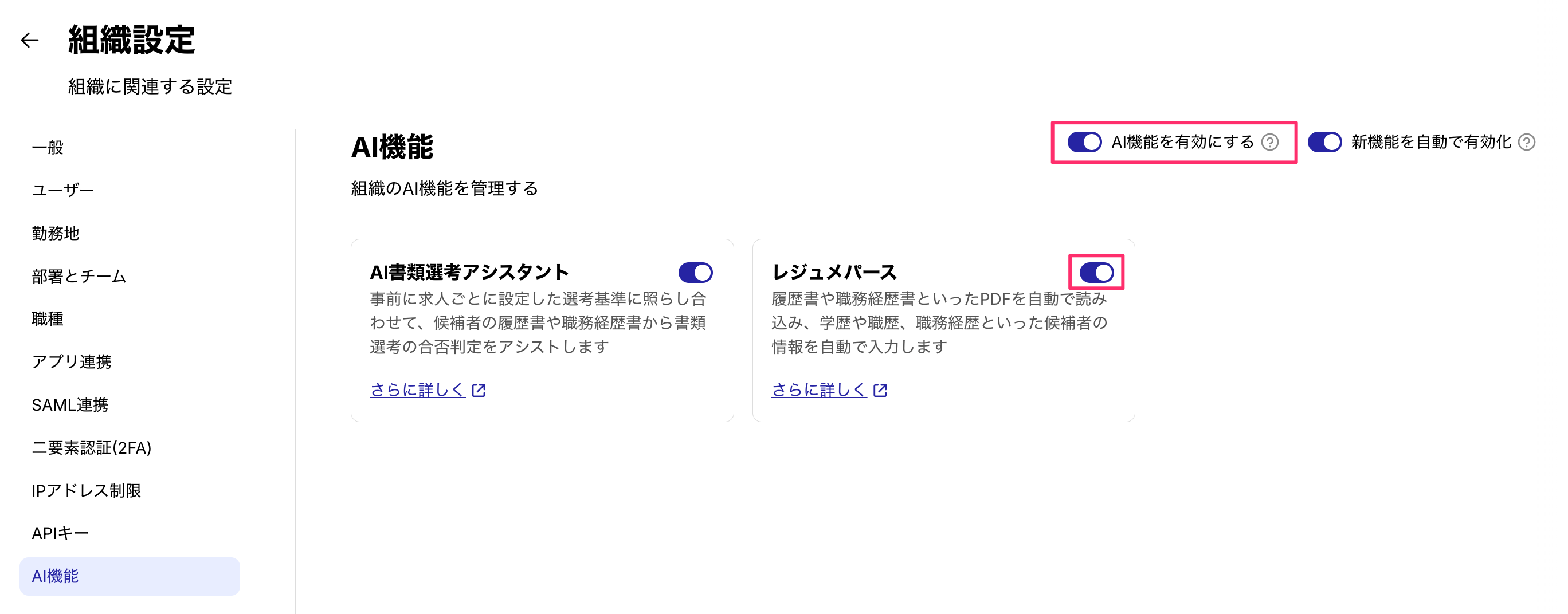 組織設定 > AI機能 > [AI機能を有効にする]ボタンをオンにする