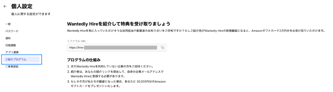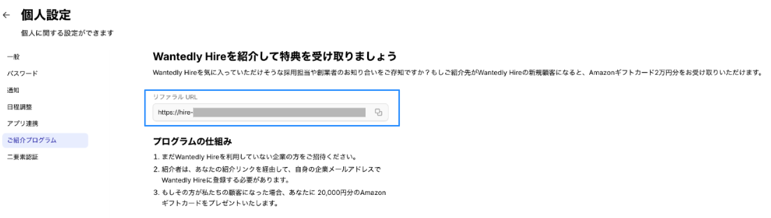 リファラルURLを、Wantedly Hireをまだ利用していない企業様へご共有ください。
